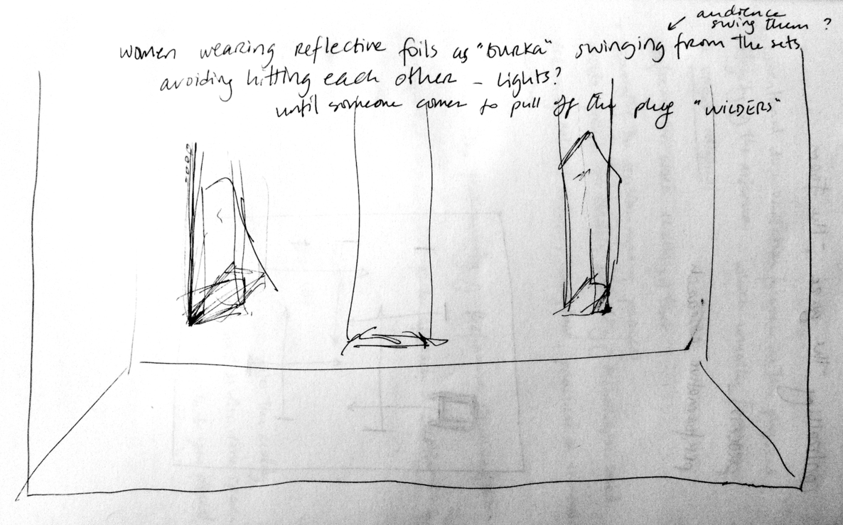 If on a public square, then the performance would happen around sunset with light on the edge of swings. If the audience is pushing the swings and see their image reflecting in the burkas, then their images go further away and then closer back to them as the women swing.