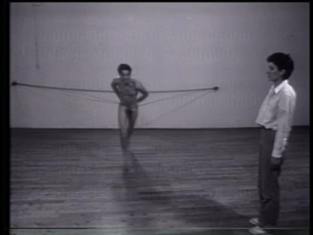 The feet are sticking out from the swing. But if my legs are dangling from the swing then the symmetry of the space is lost. It would seem as if I have a preferred space and always swinging towards that space. What if I use another set of fake legs, or a mermaid tail? Or the swing turns around its own axis instead of swinging back and forth. Maybe I am not on a swing and instead of the swing there is a revolving door in the middle of the space. But then the immersion in and entrance deep into the space is gone. This makes me think of Ulay/Abramović's performance 'Incision (1978)' with the elastic rope.