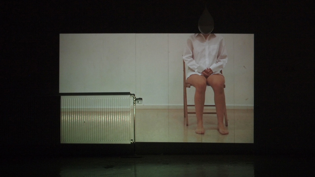 An archer walks into the physical space with a bow and arrow. Standing among the audience, he raises his bow, stretches his arrow and points at the white hanging balloon filled with water. When he shoots the balloon, the performer gets wet in the projected film.