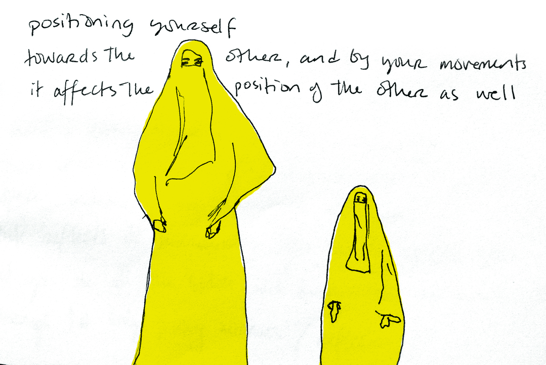 The idea of this project started from an intuitive image of eight women wearing reflective burkas and swinging in a choreographic composition on a public square. The women are in a two-axis grid, and they swing in such a choreography that they cross paths but just barely avoid a crash.