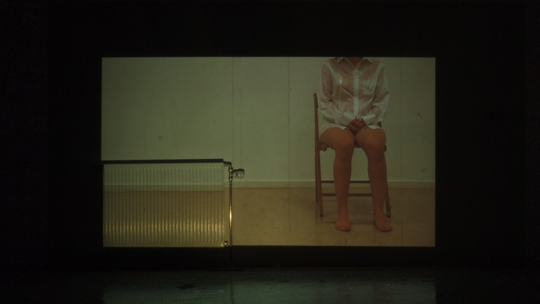 As the projected slides roll forwards, the performer takes off and throws clothes towards the viewers: sweater, trousers, shirt, socks and underwear at various rhythm. Then she starts throwing mandarines. At first one, then another, then two at a time, then one again, at various rhythms. This goes on while the projected slides are rolling forward.