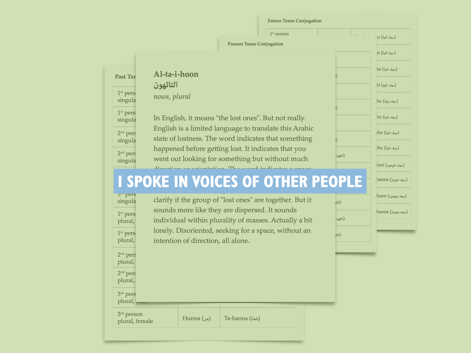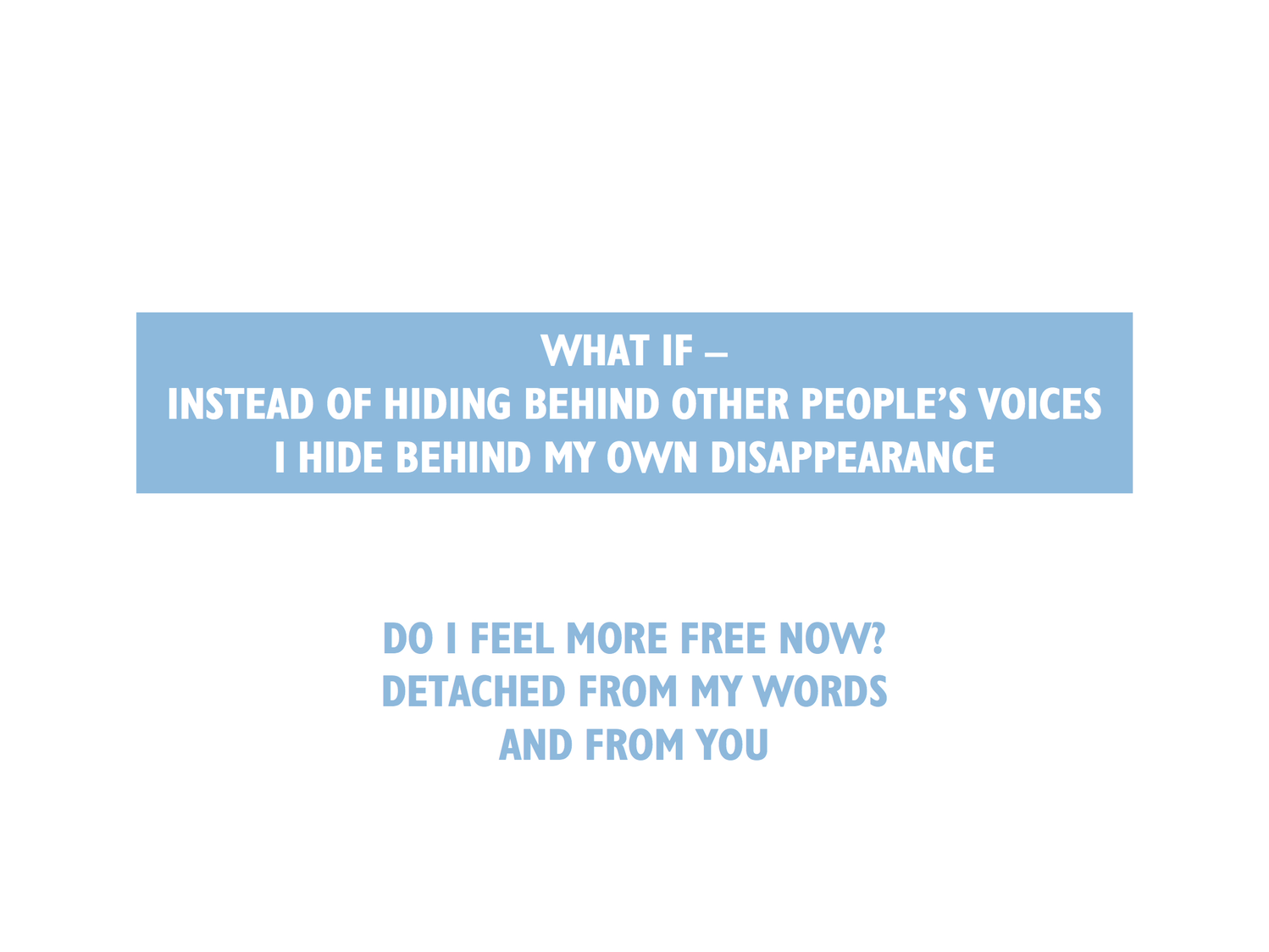 One strategy could be simply not appearing, or sitting on the fringe of being and non-being, whether by removing the voice or hiding the body. Such a strategy of not appearing challenges certain economic and institutional ideas of attributing value based on quantifiable assets. A biography with factual information about place of birth and institutional certifications is an economical tool and the way of using it and exploiting it is used as a frame to bounce from towards a broader existence.