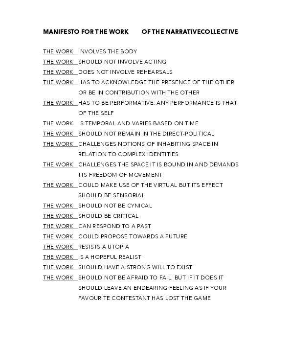 This exposition maps out the artistic process, practice and research that I - under the operating name of The NarrativeCollective - have undergone over the last two years as part of the MA Scenography programme at the School of Arts in Utrecht, The Netherlands (HKU).