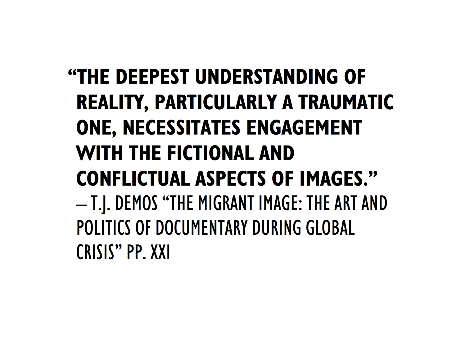 In this first performative lecture, there were layers to give the audience a distance from which to relate from. The distance was created by the performer playing a role, a character, other than her own. The silence and absence of voice also gave distance and space to layer your own voice on top of the projected visuals.