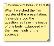 To become a collaborator you need to have a full account on Research Catalogue. If you already do or just have made one, then please click the button below and send a collaboration request to 'the narrativecollective'. As soon as you become a collaborator you will be able to post notes directly on this exposition. Whether collaborator or silent reader, please feel welcome to weave your own trajectory through this exposition.