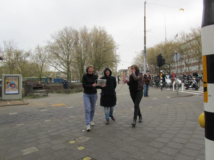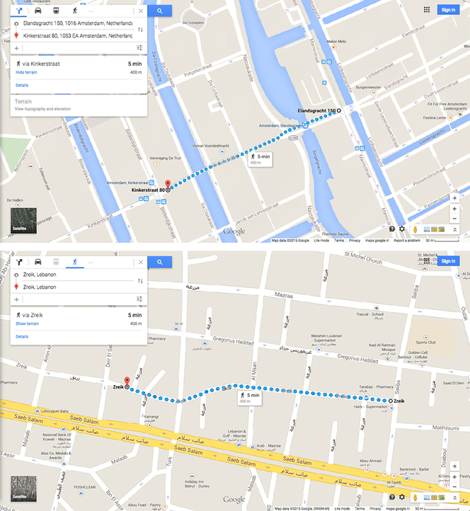 ‘Meeting Cities’ is a crossover tour and a parallel city walk. A person in Amsterdam walks 400m direction West together with a person walking 400m direction West in Beirut, ending on their respective roofs. The parallel walk is arranged over Skype, on a tablet, with a camera at the back side. They exchange the view of their walk.