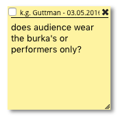 Could it be that an audience would feel subjugated and uncomfortable in democratic situations which are demanding active participation, as in social practice as in theatrical set-ups? This, however, varies based on how well-informed the subject is of the situation and the degree their opinion affects their own situation. One is more reluctant and uncomfortable to vote on an ill-informed referendum of distant effect on one's daily life in comparison to voting on municipal elections. Similarly in theatrical situations, participation of audience needs to be clearly communicated and employed as a vital contribution or rather collaboration that affects the course of the performance, rather than an enactment of pre-determined sequences set-out by the maker(s). Not to say that the latter is an invalid method, but just does not qualify for the notions of participatory art.