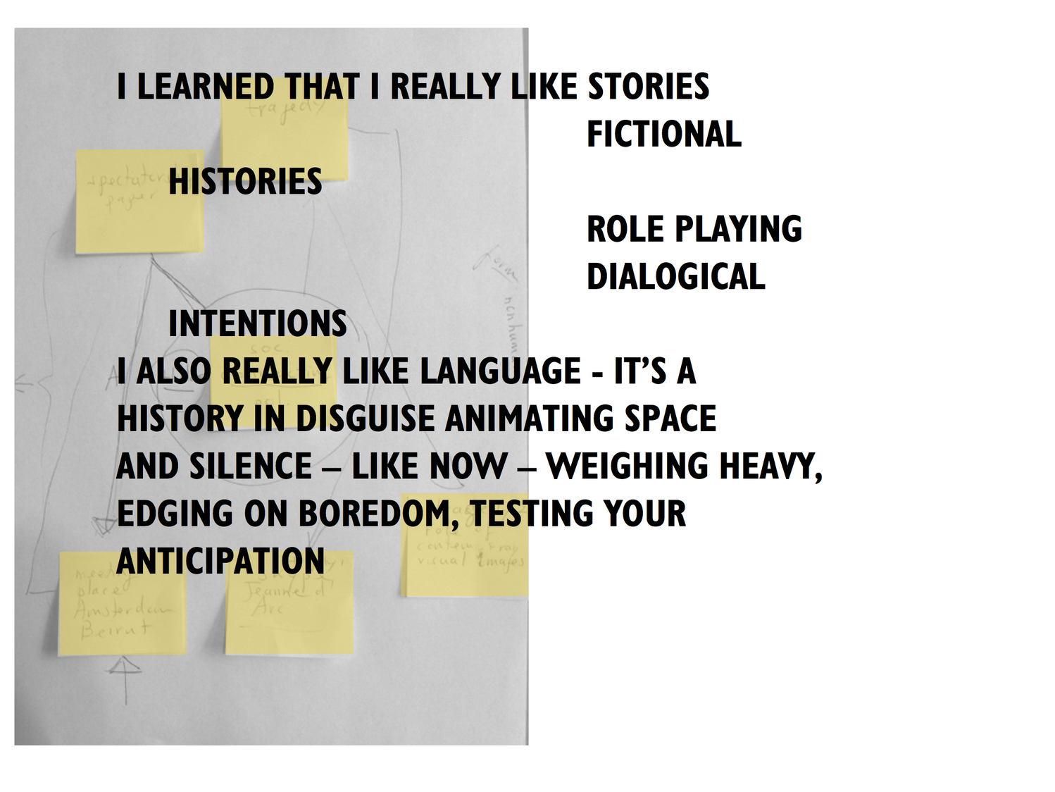 If my question is not necessarily inside this project but in a wider frame of my own experience, thoughts, desires and reflections in a performance frame and how that connects or not with the spectator – the dissonance or the resonance, or what kind of work makes the spectator closer or farther. It could be a very concrete way of asking myself through this work – giving myself the time to reflect and write about this experience and also the time to reflect and write about what the spectators imagine and how they see it.