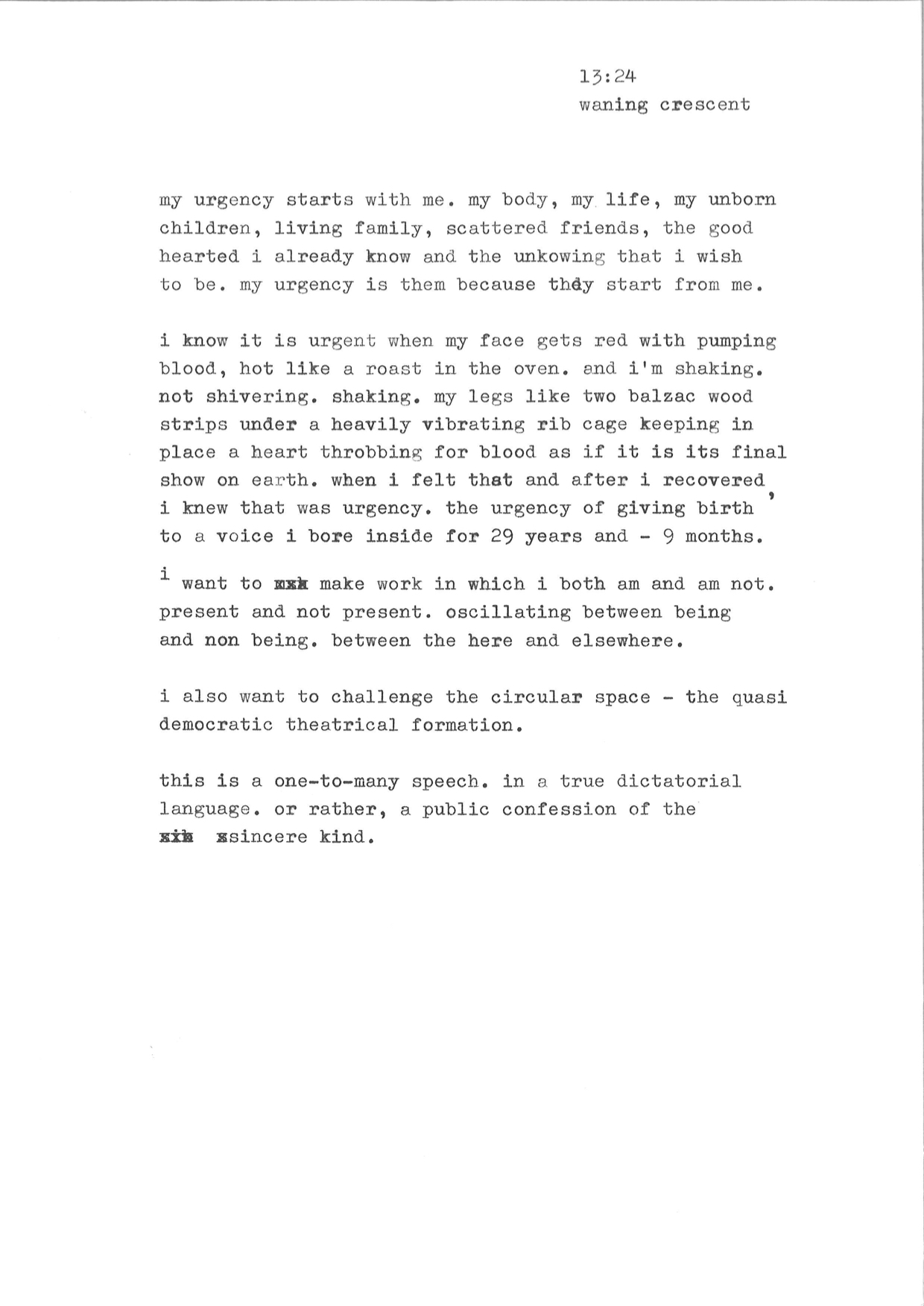 The urgency and the work with the body are not disconnected from the political. It is about knowing where the work lies and articulating that seamlessness through the categories that I set up for myself - the happening and the becoming - and grounding them in sensorial bodily experience within the performance. Then through the audience I can track both parallels of the interaction in my own voice and my own passage, as I happen and I become.