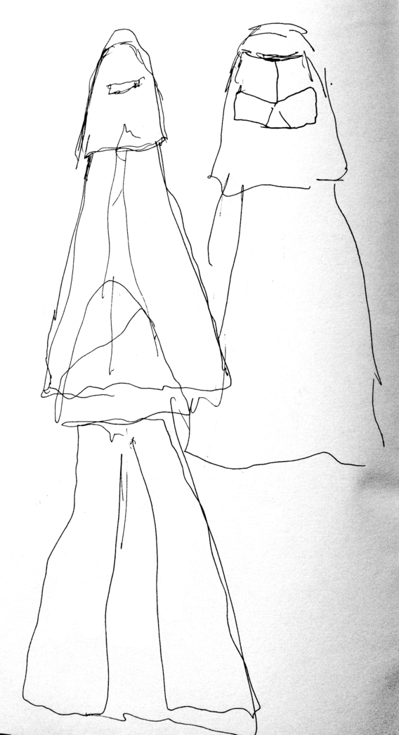 Burkas eliminate the physical and transform the body into a negative presence, thus eliminating the body from the gaze. There is nothing to gaze at, it’s a visual vacuum. Therefore the body becomes absent - a negative in the space.