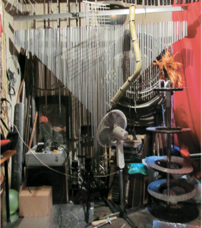 he transformed his living room into a performative set up, where we drank together and listened to the sounds using fire and water elements combined with the metal structures