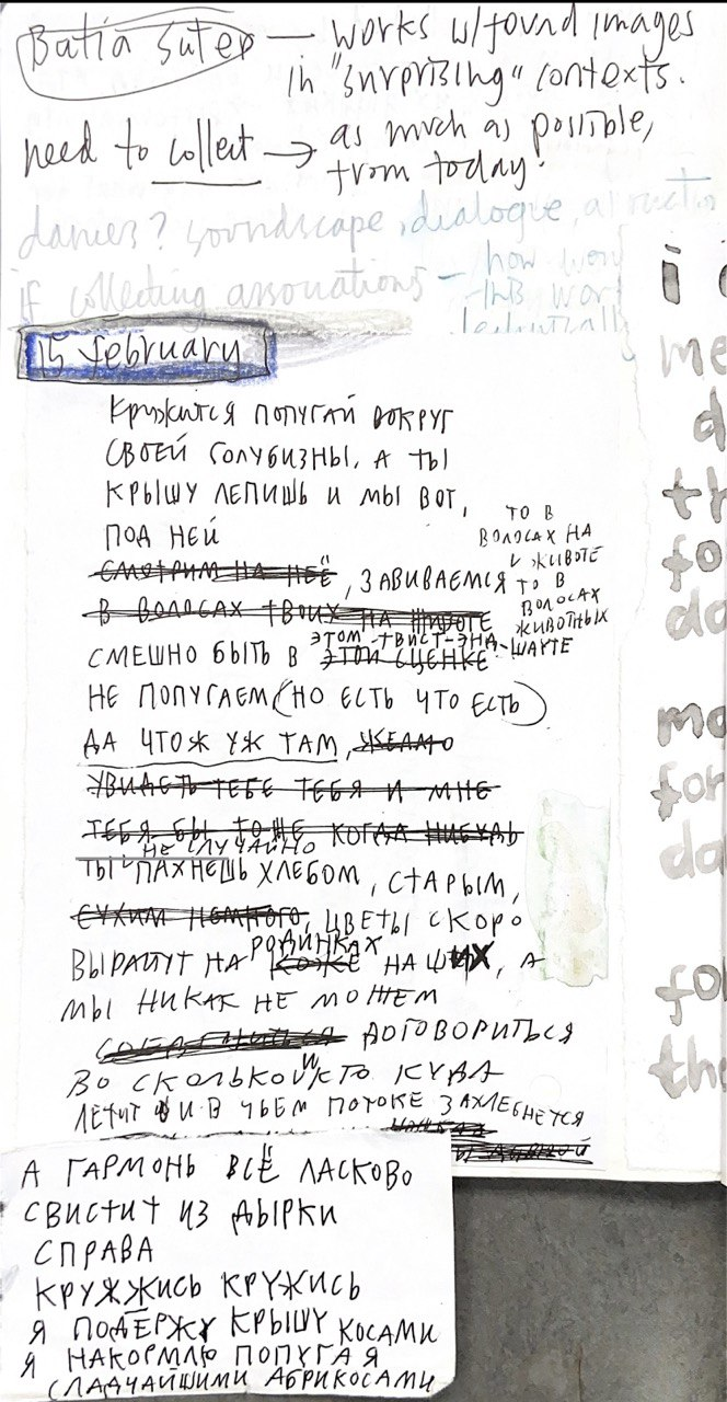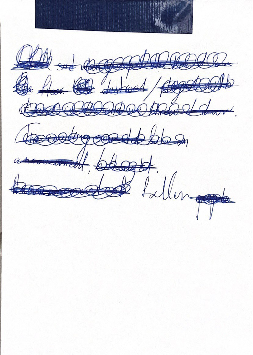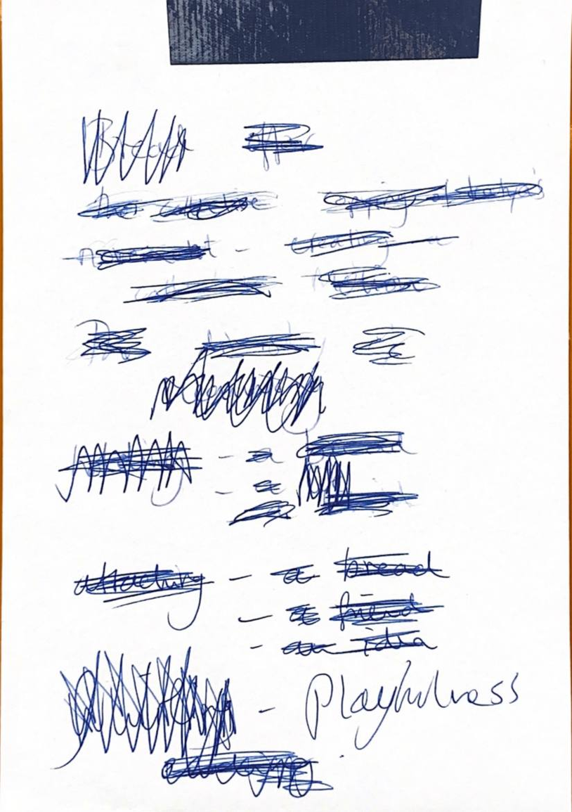 playing around with words and meanings, out loud, with others, semiotic structures as a way to tame the chaos, etymology and repetition, circling around, exhausting a word, exhausting an encounter with something, associative writing, crossing out, words as found, relationship as found