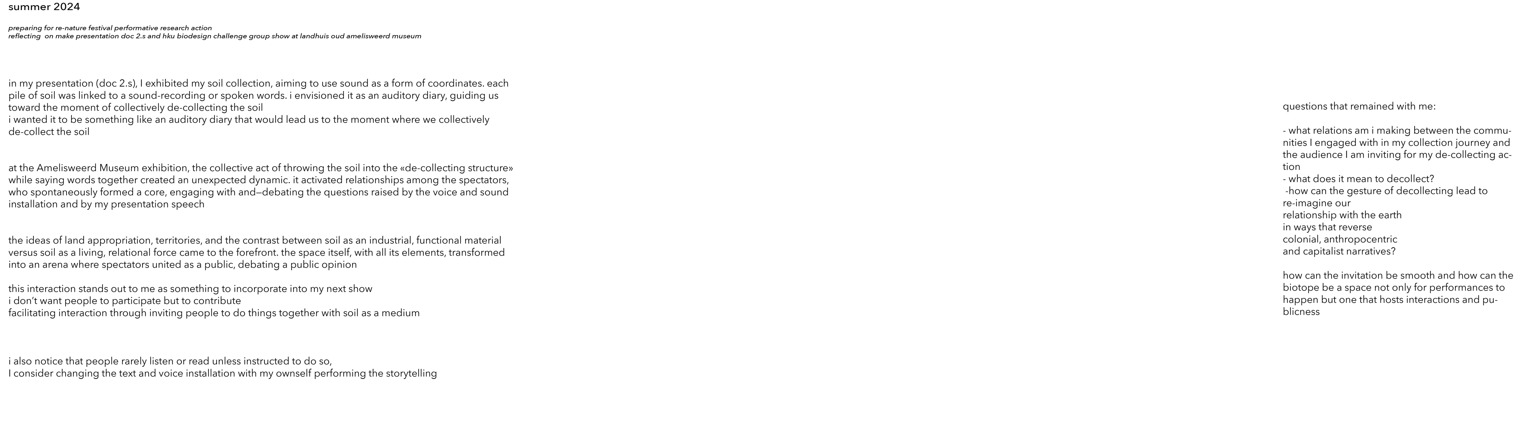 ارض حريه كرامه وطنيه land, freedom، collective dignity a slogan that has been with me for a long time, since the revolutionary moment in Tunisia in 2010, when we raised it in the protests, wrote it on the walls, banners that we held high, we sang and shouted it, it recurred in our writings, in our conversations, in our dreams of the sovereignty and independence of our lands. today I see, we see, houses bombed, falling down, turned into dust, piles of stones, dirt. the land carries it all, embraces the decay and transforms it. Down there, other times lie, invisible, suspended from the narratives of control and structures of oppression that dominate the realm above. in the past semester, perhaps even years, I have turned my attention to the interstices in cities that have been created, or rather overrun, by the political programming of urban spaces. They have become areas that have no specific function, no specific production value, no active role in the web of trajectories, signals, instructions, restrictions, power relations... they are just there immanent I like to go there, to step aside from the flow of traffic, to stand in the in-between corners that people hardly look at. I am always wandering, wondering how I can inhabit them, reconvert them, activate their performative potential, claim other times and relations that neutralise or reverse the dominant narratives around me. I took the act of strolling as a ritual, a method. I looked and all I found was dirt, soil, biomass, decaying debris, stones inhabited by microscopic organisms, a complex stratum composed of various "others". everything felt connected and embedded in itself. robert smithson wrote in an article: "the city gives the illusion that the earth does not exist. but what I saw was a symbiosis of things we often see as separate, they grow, they evolve, they shift as a one, a network of self-organising systems. There's no master, no slave. I saw in the land a biosphere highly charged with inter-independent times, stories, histories, memories, dreams, identities, homes, belonging, roots... they are all there, traces of our past, inherited from our ancestors, and of our present, which we define ourselves. monday, half past nine, the air is slightly aggressive, my hands are cold, I am collecting soil in this area behind the railway. I haven't broken any laws I promise, I haven't jumped any barriers, I've just been following the side of the canal. I don't really choose where I stop, the ground calls me, I respond. I walked to the back of this area that has no title, I found a small door hidden behind the herbs. It opened onto a cemetery, beautiful and quiet. I remembered Michel Faucault and his concept of heterotopia, which also fascinated me during the first semester. he described them as spaces absolutely other, the city's sacred and immortal wind. I saw in the in-between spaces of the city what I call heterotopias, a land for altered human and non-human relations, friday, february is almost over. spring is shyly approaching, I could see and touch it as I bent down to collect some earth. today I had an encounter with a microscopic, translucent creature. I've observed so much autonomy and self-sufficiency through it. vivieros de castro, a brazilian anthropologist interested in the amazonian cosmologies and amerindian perspectivism (the way in which humans, animals, and spirits see both themselves and one another, an idea that suggests a redefinition of the classical categories of « nature », « culture », « super nature » based on the concept of perspective). said in one of his lectures: "the experience that each 'self' has of the 'other' can, however, be radically different from the experience that the 'other' has of its own appearance and practices." -- Lecture 1, p. 51 it seems to me that when we turn our gaze to our other, non-human selves, who perceive reality from a different perspective, within a very different temporality, we learn so much about how the world is of relative semblances, for example, what is solid earth to us is airy sky to the beings who inhabit the strata below us, and what is airy sky to us is solid earth to those who inhabit the strata above us. it is a world of relative semblances, where different kinds of beings see the same things differently. in the last few years, before coming to the Netherlands, i've been volunteering on organic farms, dynamising the soil, collecting and redistributing biomass, planting wild forests... this has taught me a lot about how what happens in the soil can influence what happens above it, in terms of self-organising structures, symbiosis and, above all, solidarity. these last few months have also taught me that solidarity comes with love, it's hard to relate to the feeling without having love as a drive.