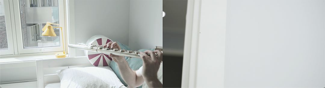 In such a perspective approaching the two-dimensional, it is possible to imagine architecture as a score, as visual and spatial rhythms and proportions that may inspire musical action. What the music reads, what role the apartments play in the sound Lemur creates, is however not necessarily evident from the outside. The three portraits have different but internally consistent musical languages – from the short-breathed and energetic to slim, contemplative lines. When the cameras pass the performers, they often seem to be working with internal imaginations, eagerly listening with their bodies, optimizing the sound of their instruments to the surroundings and to each other. The music is improvised, but still appears secure in the sense of a practice in which the musicians are confident.