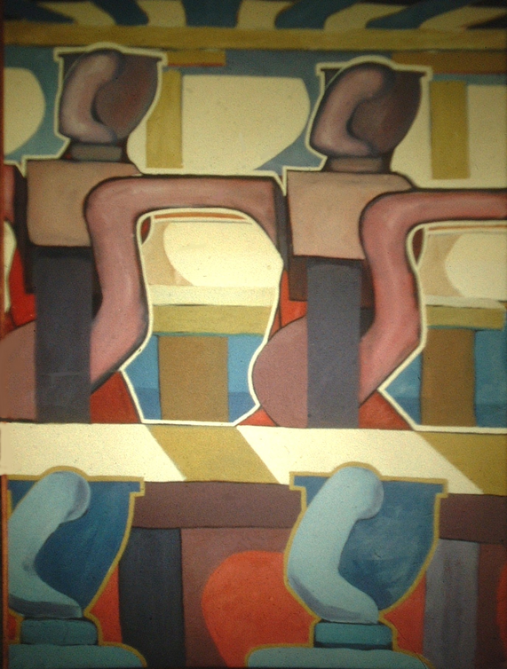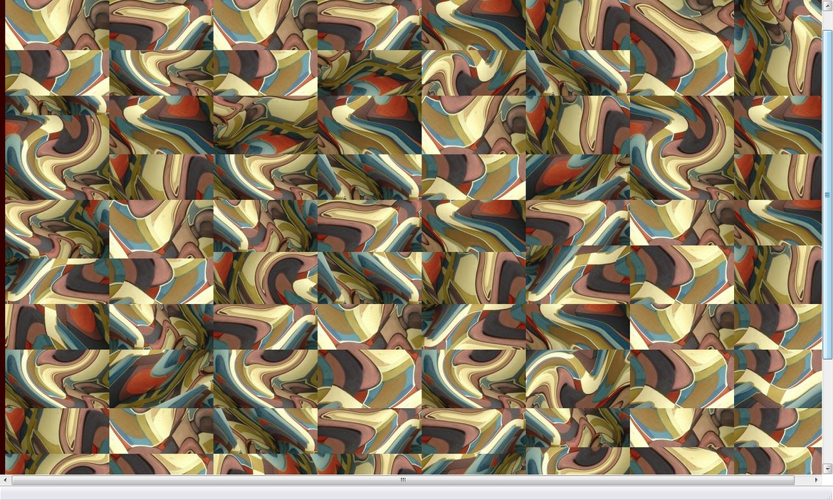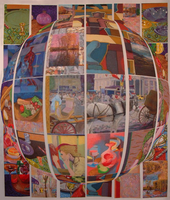 This series is derived from the painting Institution. Parts created from sampled sections of the painting, and digitally repainted are organized in groups and called by the program. The program I am using is a simple Java script display window. It was created with the intent of showing a rotating group of pictures on a web page. I have re-written the program to a multi-grouped modular complex including variables within the sub groups. The design is similar to a digital colony.