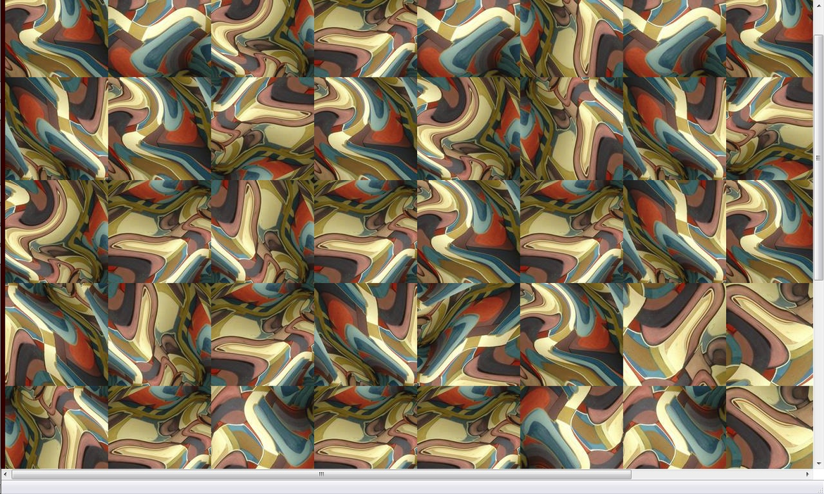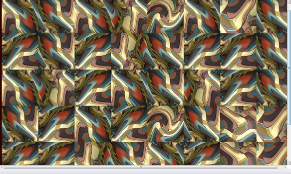 #6 (starting from uniformity) Disruption is the norm and includes aFX_sil_4_rt1, (end 1st row common) There is no unified field presented in this program. The cycles suggest that such a thing may exist, but not in this program. Metaphorically I relate this to life. The complexity, apparent randomness and glimpsing of dissected parts rotation past our perception make a strong suggestion of structural unity but in fact disrupt us with diversity. At the same time the insisting patterns keep our focus on the probability of unity.