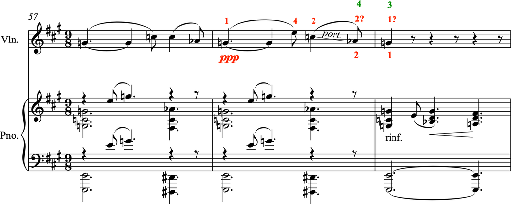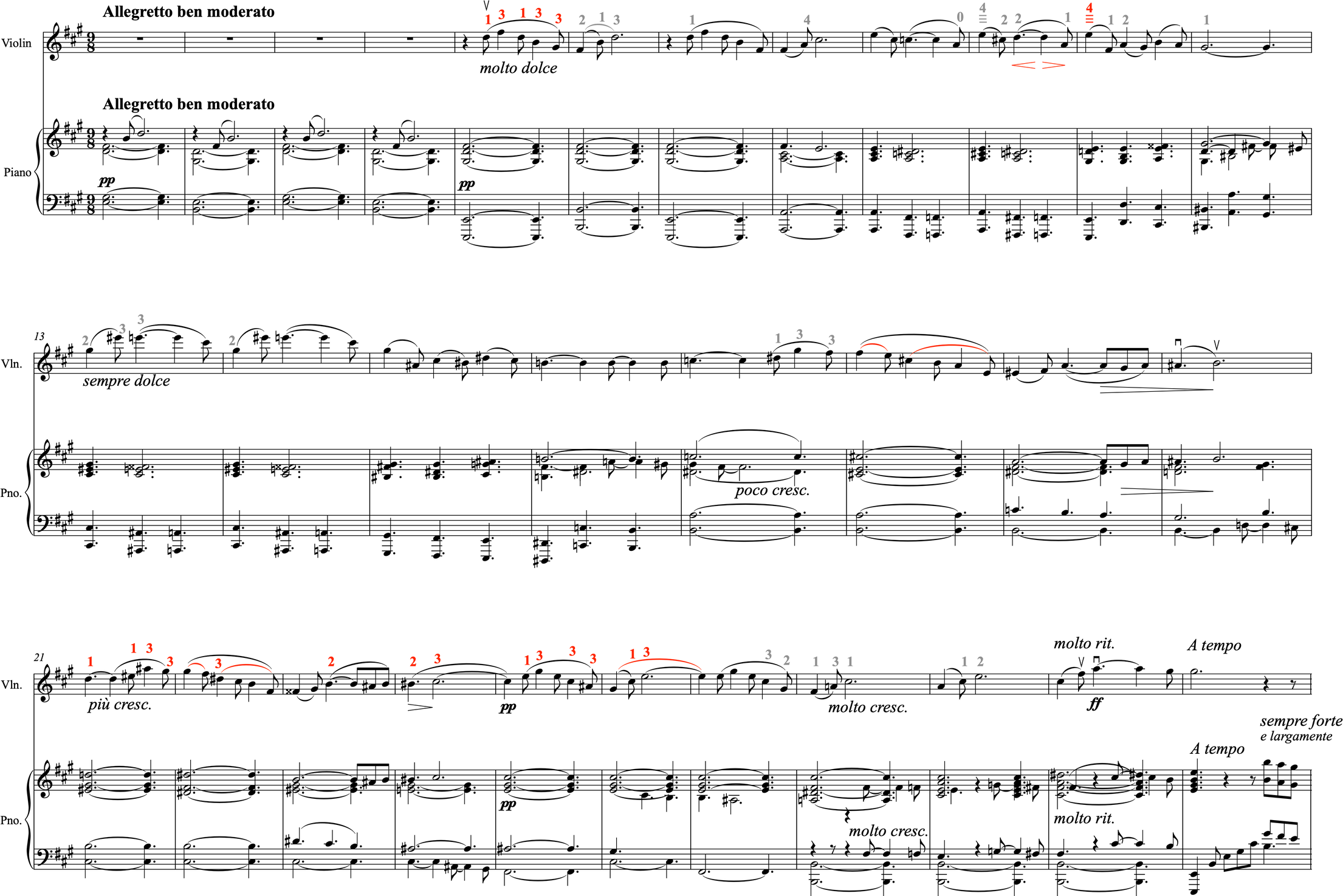The red markings on the score represent Ysaÿe’s annotations. The grey numbers are the fingerings for which I remain uncertain whether they were annotated by Ysaÿe or Mitchell.