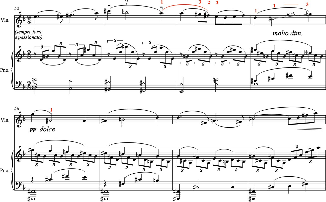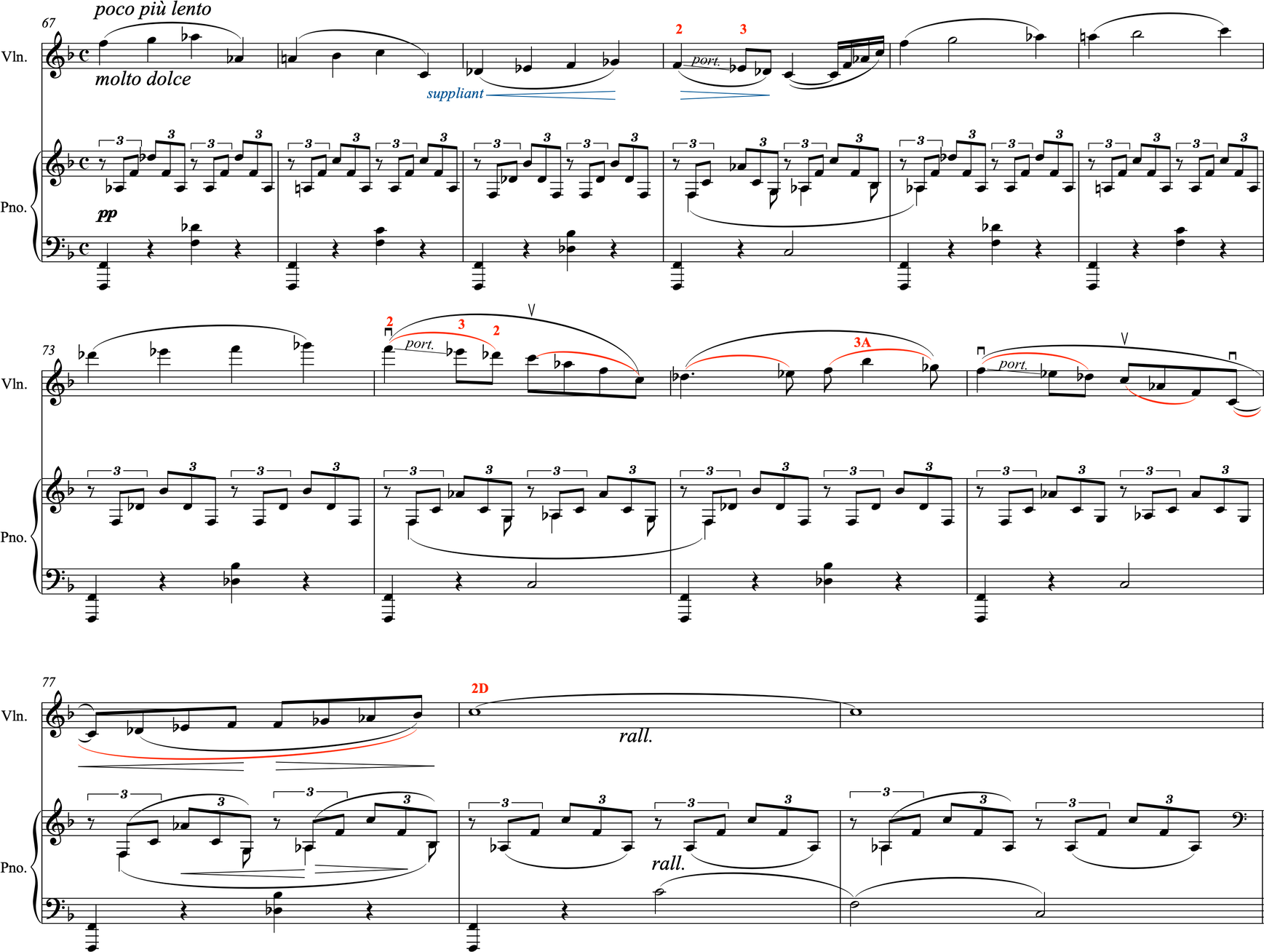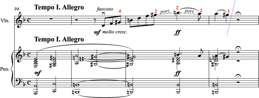 In our recording we have explored the potential of these elements (bowing and portamento) in creating a powerful character, in line with Franck’s intense dynamics (mf - molto cresc. - ff) and fuocoso indication.