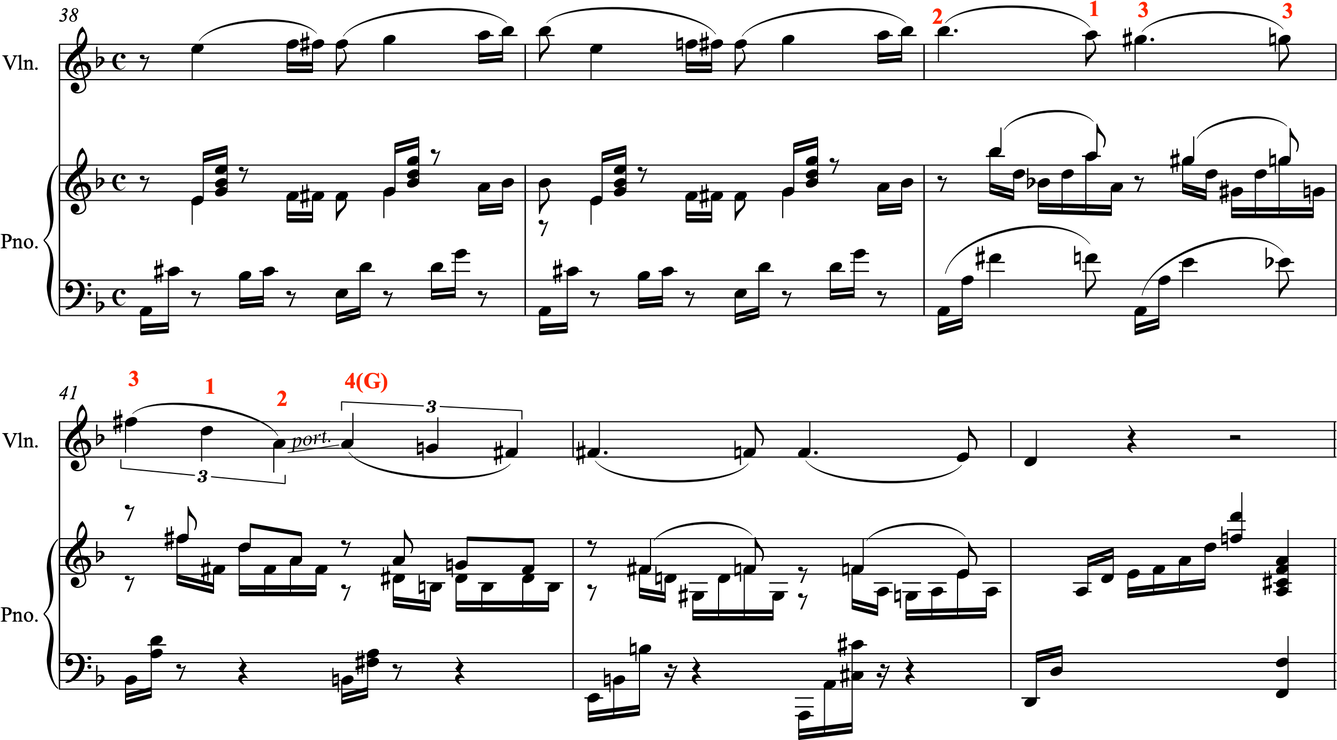 An example of a portamento between notes in unison played with two different fingers, which is often called ‘bariolage portamento’, can be found in the bar 41. Ysaÿe annotates the first A in this bar with the second finger on the D string and the second A of this bar with the fourth finger on the G string (see Figure 8). Typically, in this kind of situation, he would slide with his finger on the lower string covering the distance of around a third (i.e. from around F sharp in this case).