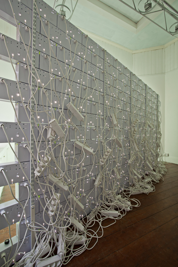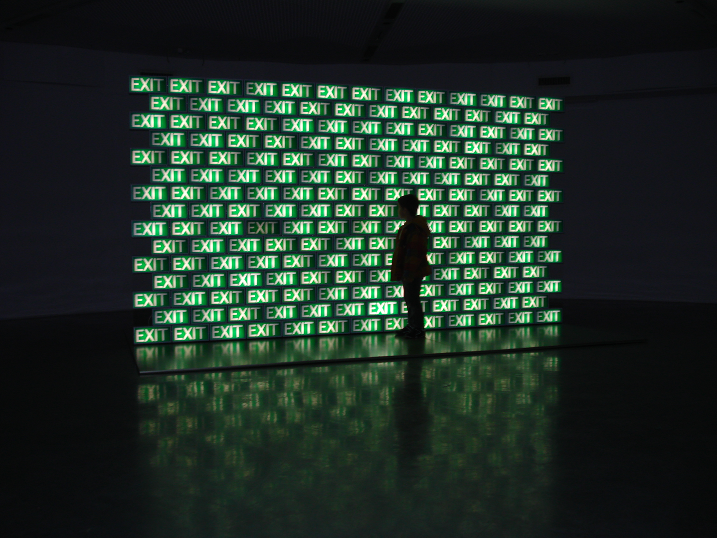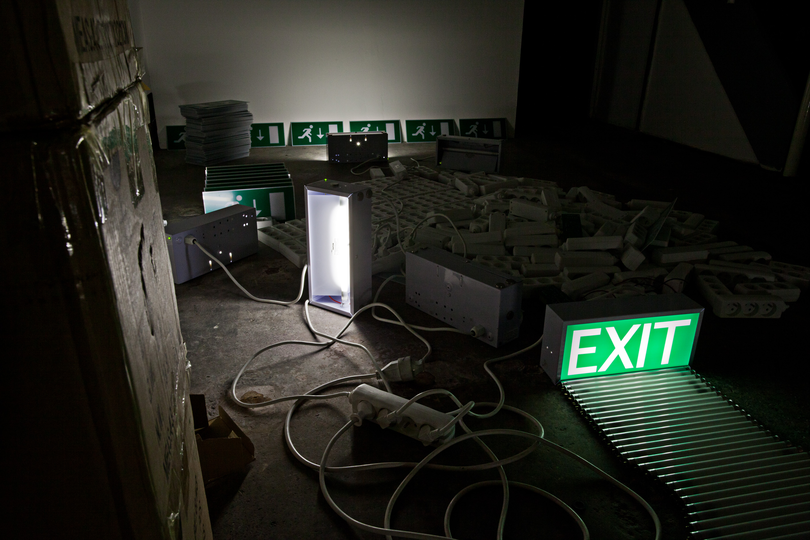 Exit-Wall was developed over several stages; it emerged in different forms and contexts between 2009 and 2012. The pivotal artefact of this project is a modular wall structure, entitled Exit-Wall (2010), which is assembled from about two hundred exit lights. Usually such lights are used in public spaces to indicate an emergency escape route to the outside. In contrast, we employ the exit signs like bricks in a wall to build a barrier within a space. For us, the paradoxical nature of this assemblage – originating from the contradiction between the linguistic meaning of its constituting parts (the exit signs) and the physical obstacle it poses in reality – evokes the inherent ambivalences of different real-life contexts. For instance, one could argue that it points to the problematics of predominant economic politics, in particular the obstinate insistence on growth being the only solution, or the only exit, to the current crisis – whereas a radical rethinking of inhabiting the world in a more sustainable way might be more appropriate.