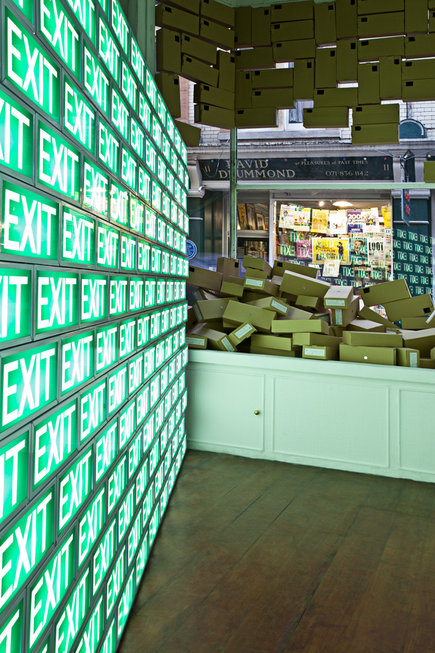 Figure 4. Strategies of Deception (2012). View of the ground floor gallery from inside, with Exit-Wall on the left-hand side. A large number of cardboard boxes in the gallery window have been displaced by the public.