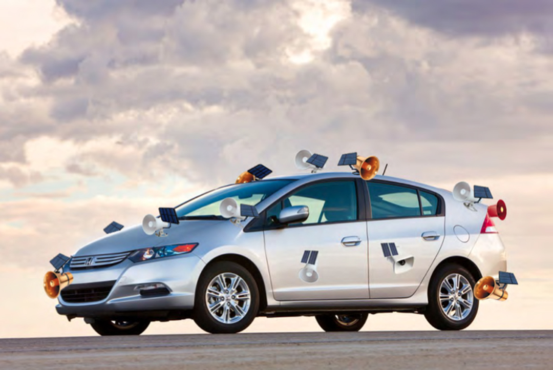 Figure 9. ParaSites: Antibodies (2012) Croquis of ‘antibodies’ attached to a hybrid car. The image reflects the initial idea for ParaSites: Antibodies, to occupy the new sonic niches provided by near-silent vehicles and to compete with so-called Acoustic Vehicle Alerting Systems that are currently being developed for electric and hybrid cars.
