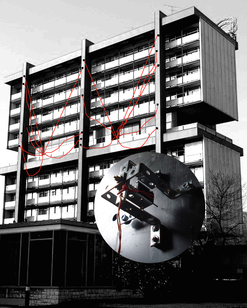 Confronted with the impressive ‘dead’ mass of the building, we thought about the behaviour of parasites that, most naturally, infest and profit from a vulnerable body. We devised little electronic ‘parasites’ that attached themselves magnetically to an iron skeleton (figures 7 and 8). The parasites prodded their host with their electromechanical stings, making the monumental architecture resonate in a subdued manner. The impacts also caused brief detachments of the parasites from the surface allowing them to jitter slowly downward along the pillars. In this way, the parasites followed the same top-to-bottom trajectory that had been conceived by the architect for the suspension of the building’s body and, in a figural sense, reunited the conceptual strength and the structural decay of the edifice in a descending movement.