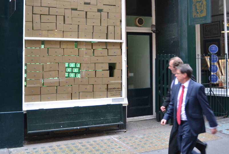 Figure 3. Strategies of Deception (2012). Street view of the gallery window. Some cardboard boxes have been displaced by the public, gradually revealing Exit-Wall installed on the ground floor of the gallery.