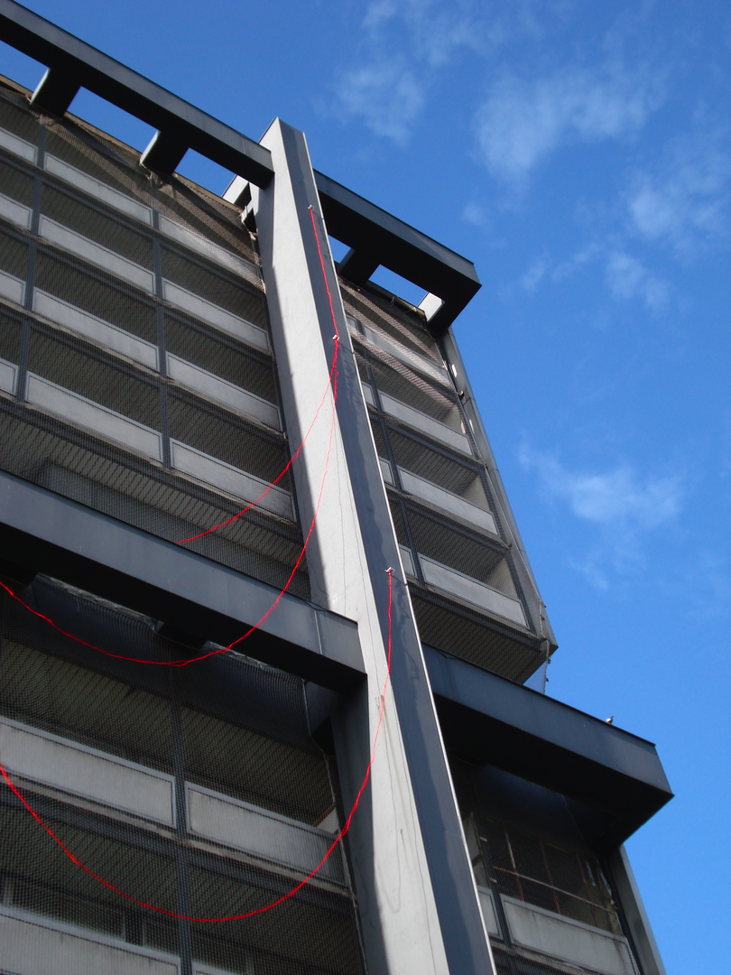 Concretely, we seek to take resource in the richness of parasitic qualities – such as inconspicuousness, integration, expansion, interference, mobility, opportunism – in order to ‘profit’ from the vast realm of potential hosts (their physical properties, histories, current functions, and urban contexts) as well as adapt to different socio-cultural and economic situations for the interventions (e.g., exhibition budget, relationship both with organisers and with public, etc.). We will illustrate our employment of parasitic strategies with two examples, the first being the initial intervention that sparked off the overall project. It took place in 2009 at the Fondation Avicenne in Paris, an edifice designed by architect Claude Parent in 1968. The building’s ‘body’ was constructed from top to bottom, suspended within an exterior ‘skeleton’ of six colossal iron pillars (figure 6) – a detail that retained our attention.