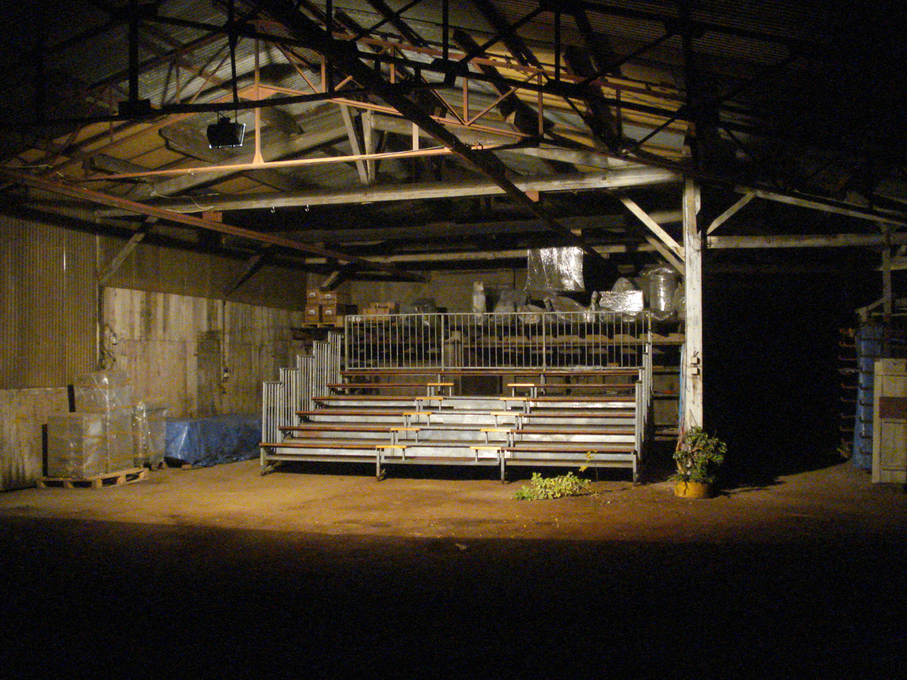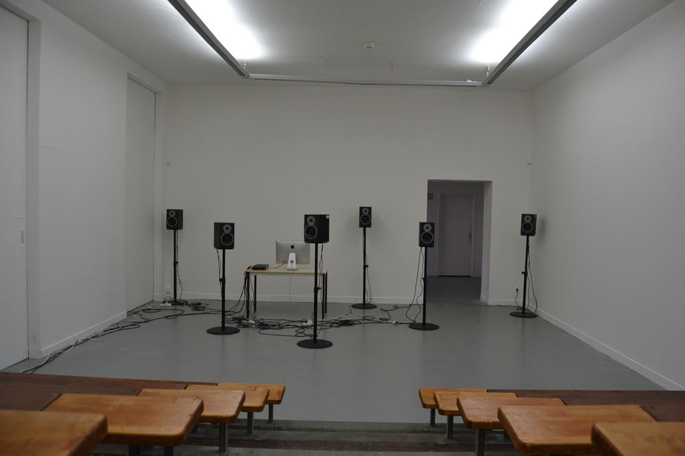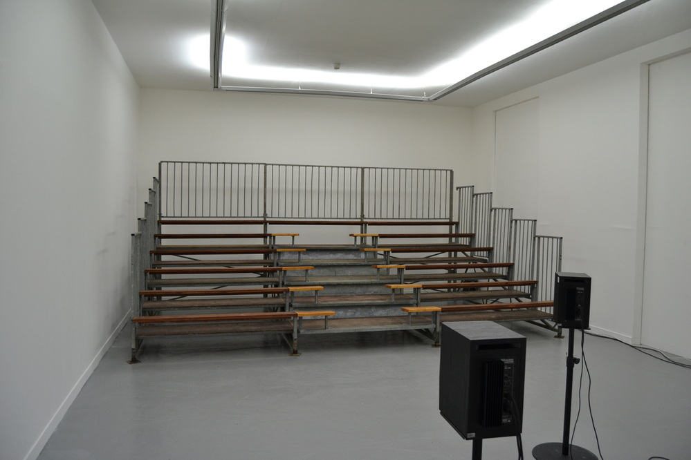 As it happened, before the event at La Box gallery, we had been contacted by Pierre Bamford, an artist based near Bourges, who inquired about the possibility of cONcErn to accommodate a unit of bleachers which he had recently recovered and which he intended to use at a later stage in the context of a performance project. On the one hand, this request fell somewhat outside the remit of cONcErn because, in our view, the bleachers neither could be considered an artwork in their own right nor had been part of an artistic project. On the other hand, the bleachers could be considered to be an enriching element for our host environment in Cosne – if nothing else, the possibility of providing adequate seating for audiences at forthcoming events seemed attractive – and we considered it pertinent, logistically as well as conceptually, to benefit from our requested presence at Bourges as a means to recover Pierre’s bleachers at no extra cost and by using existing resources (i.e., a return journey between Cosne and Bourges with an almost empty van, compared with at full capacity). What is more, the bleachers not only triggered the conception of our artistic proposition for La Box gallery but actually became an integral part of it: they were installed in relation to a six-channel sound installation based on a re-edited recording of Œuvres Bémol that comprised six loudspeakers ‘onstage’, each of which was assigned to the voice of one of the six actors of the original performance in Cosne-d’Allier (figures 28–29). From a formal point of view, we felt that the ghostliness of the empty bleachers resonated strongly with the disembodied voices of the sound installation and, at the same time, the installation as a whole was an invitation for the audience to absorb and replace this emptiness with the presence of their own bodies.