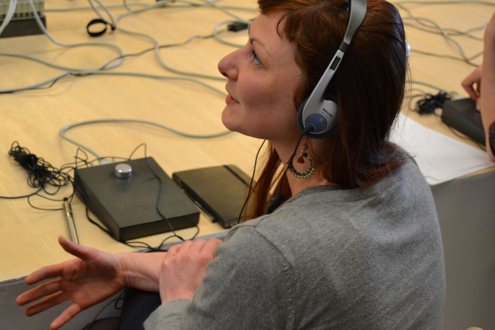 Figure 23. cONcErn – a participant in the performative discussion with Philippe Mairesse using the dispositif d’écoute.