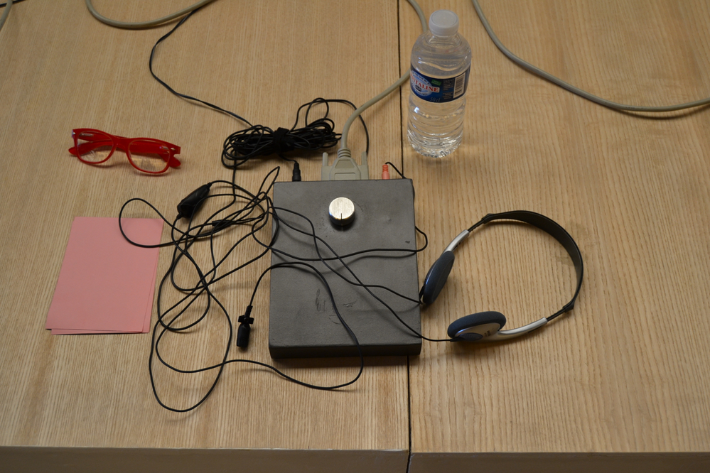 headphones, a lapel microphone, and a custom-made dial box.