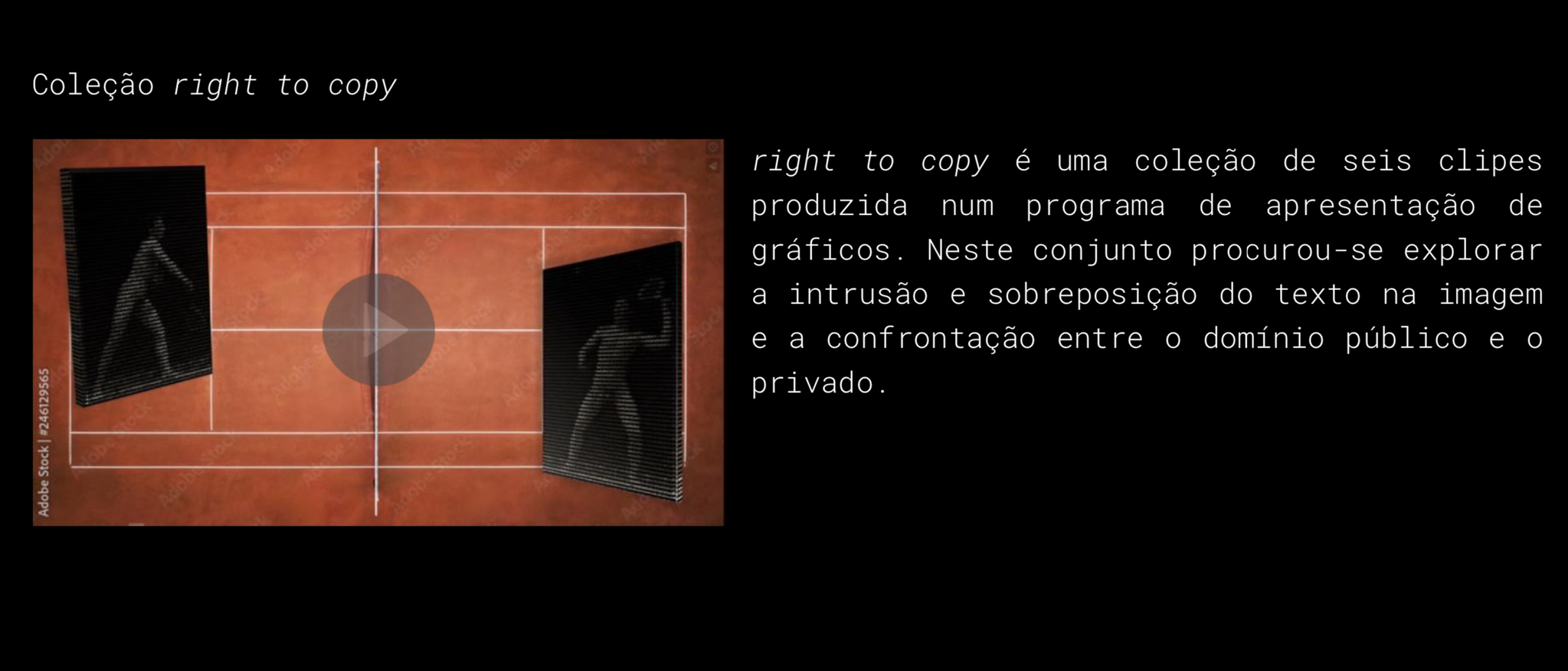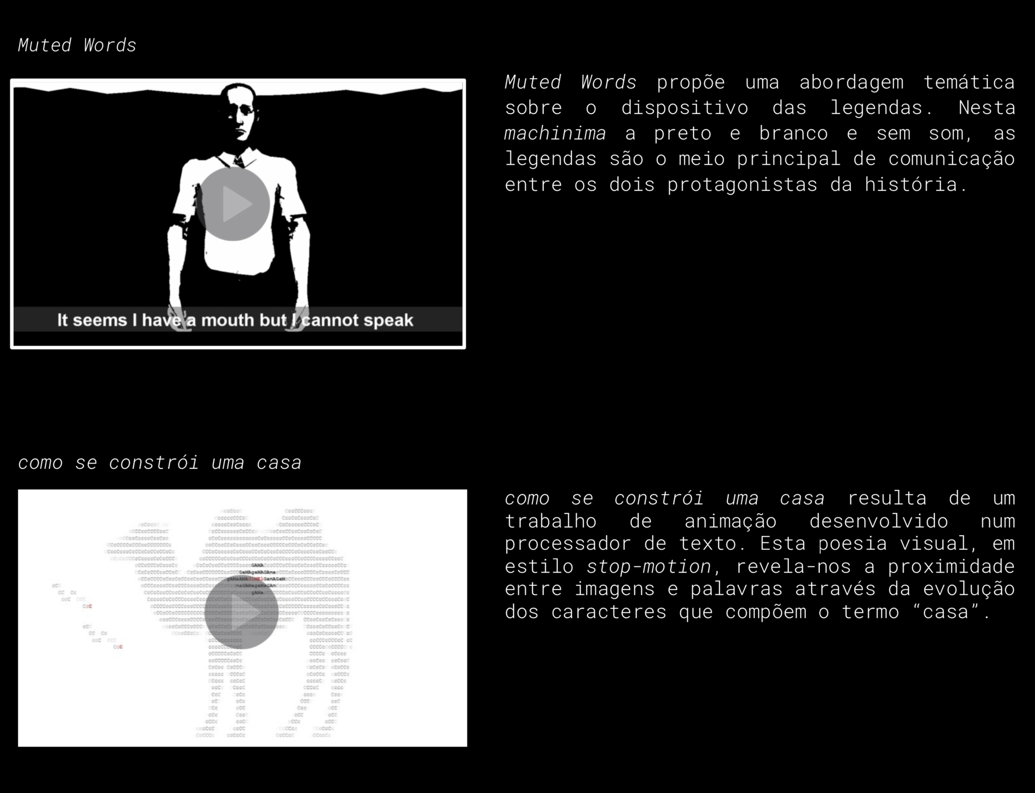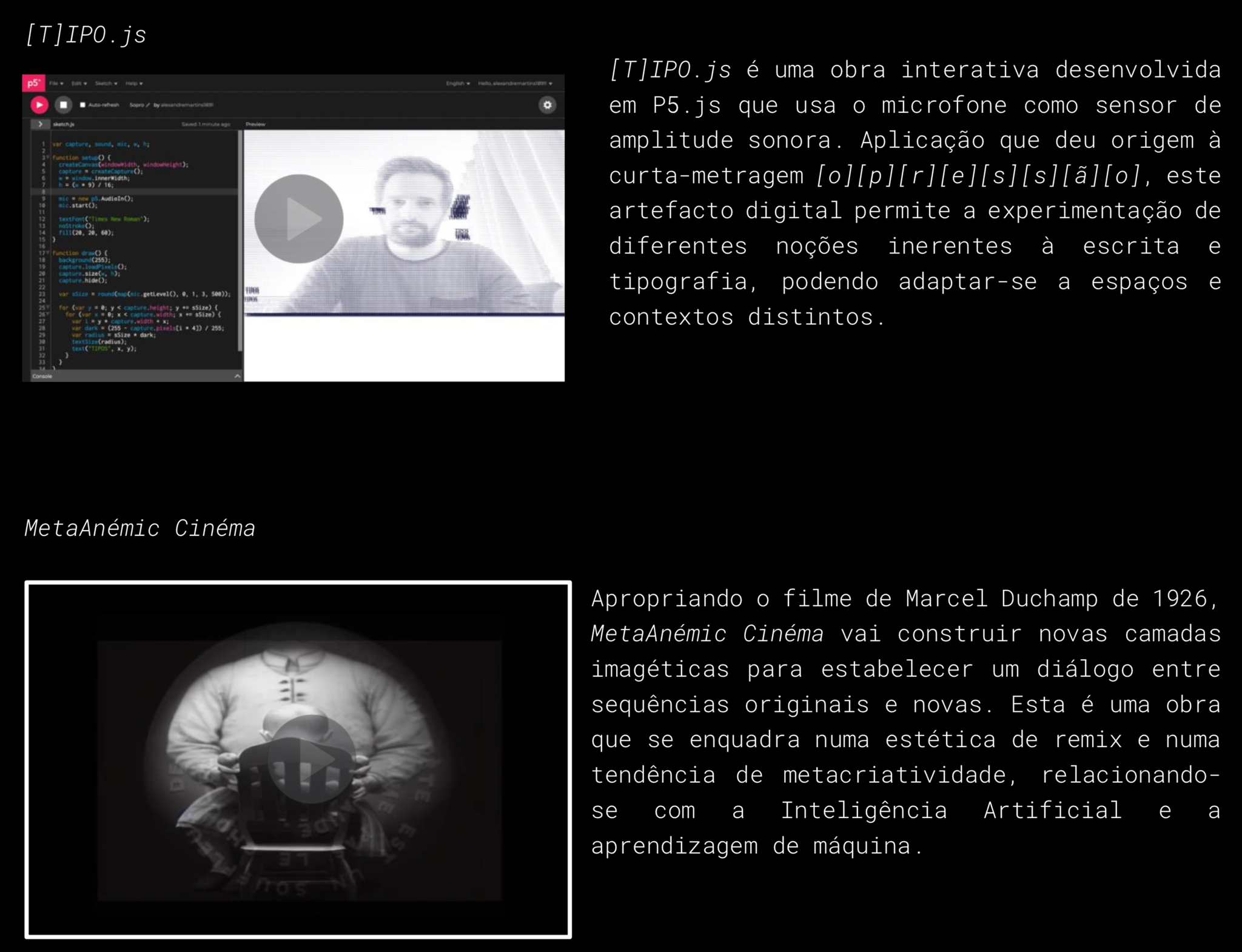 licenciado em Línguas e Culturas Estrangeiras (ESE-IPP 2018). É investigador no Centro de Investigação em Artes e Comunicação (CIAC), onde desenvolve estudos nas Artes Digitais e Comunicação Audiovisual. A sua produção artística tem-se debruçado na exploração e experimentação da tipografia e palavra escrita.