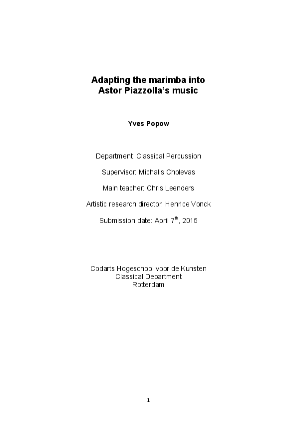 It is common in the percussion world to play the music by Astor Piazzolla without being proficient in the Tango style. A lot of percussionists, including me, simply play the piano or guitar parts on the marimba without making any adjustments to the arrangement, because it sounds good to us and it is technically possible. By copying directly, we think we know about the style, but we are wrong. This issue can also be found in the marimba arrangements of Bach’s Cello Suites. In my opinion, one should research about styles of the compositions if they were not originally written for percussion. Otherwise one will never be as close as possible to the intended style, which is essential for a good performance. Since Tango is about arranging, my goal is to find a suitable role for the marimba in the music of Astor Piazzolla that is as closely aligned to the stylistic traits of Tango as possible.