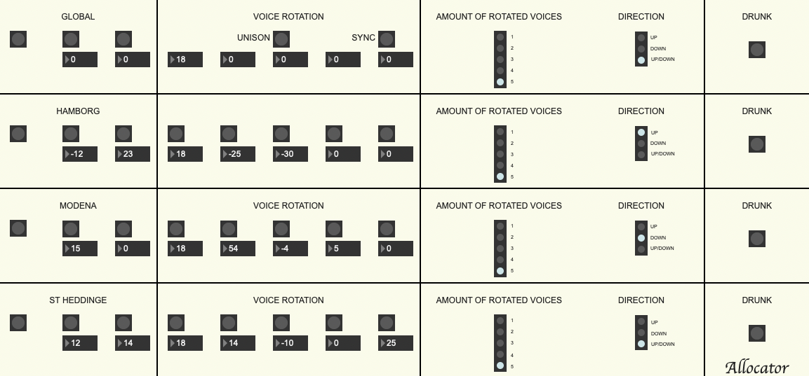 Along the way, I found it interesting to design and integrate another piece of Max software: an allocation app. The inspiration for the app came from the Oberheim synthesizer company. Oberheim started in the 1970s by designing the Synthesizer Expander Module (SEM), which could be connected to other synthesizers like the Minimoog, adding two extra oscillators. Later, they combined several SEM modules and added a keyboard. Depending on the number of modules, these instruments were called 2-voice, 4-voice, and so on. For example, on the Oberheim 4-Voice, you could play polyphonically and multitimbrally, with each voice assigned its own dedicated synth module. It was also possible to play in other modes: Unison, where all modules play simultaneously, or Rotate, where the modules activate sequentially. If you tuned the modules differently in Rotate mode and subsequently played, say, three chords, each consisting of three notes, by repeating the same three chords, there will be a change of modules and, thus, a harmonic change. My Allocation app uses a similar rotation system.
