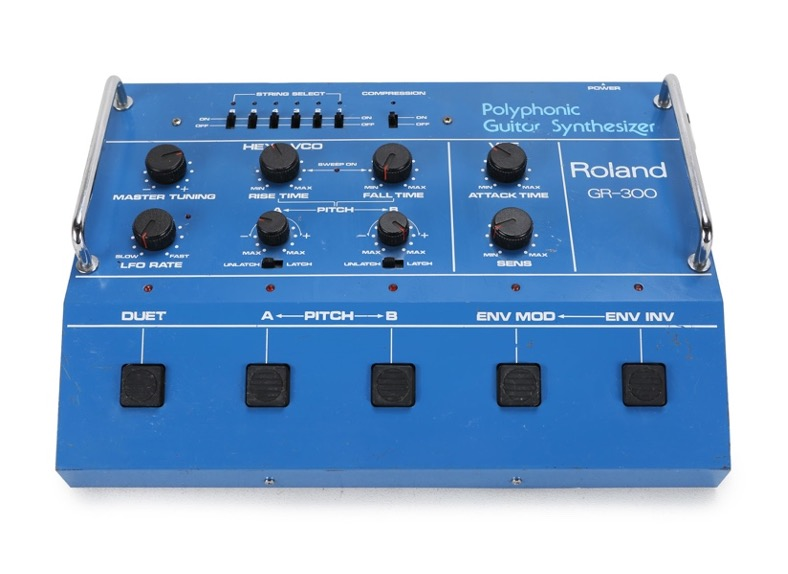 Given my focus on pitch manipulation and glissandi, I also turned to stringed instruments for their ability to slide between notes, adding a further dimension to my sound exploration. I chose Roland’s guitar synthesizer, the GR-300, which converts each guitar string’s pitch into an analog oscillator. This instrument is probably best known from artists such as Pat Metheny (solo synth sound in Are You Going With Me?, 1982), King Crimson guitarists Adrian Belew and Robert Fripp (The Sheltering Sky,1981), and Andy Summers of The Police (Secret Journey, 1981; Don’t Stand So Close To Me, 1980). Summers often tuned the synthesizer’s two built-in oscillators in fifths, resulting in harmonically rich chords (e.g., a C major chord also includes a G major, forming a Cmaj9). Similarly, I worked with different oscillator settings and strings tuned in various open tunings. Like the PPG Wave, the GR-300 added an extra dimension to the sound universe.