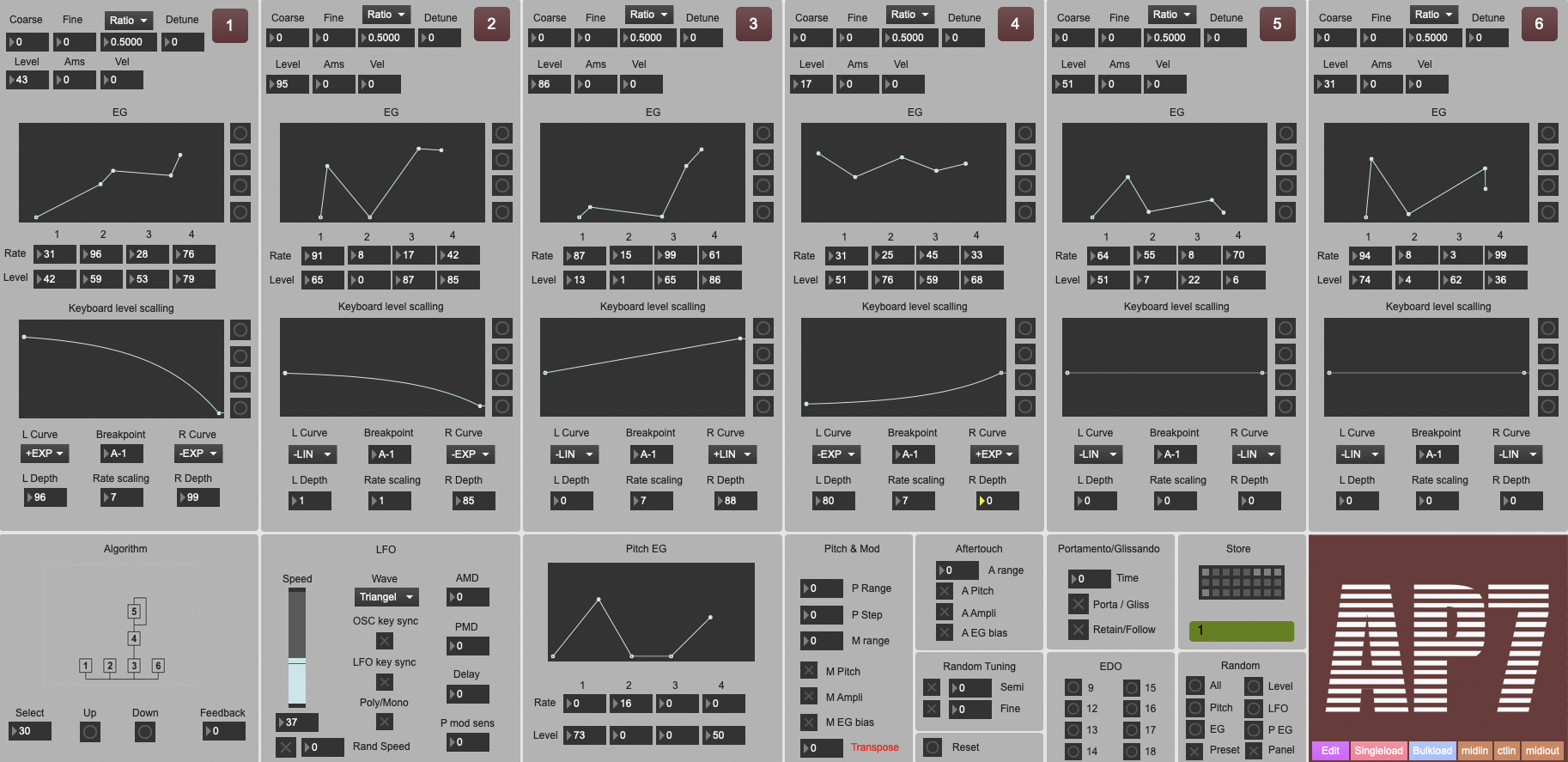 I also added a metaprogrammer, which can be seen on the right side. Rather than programming sounds in the AP-7 alone, the TX-2416 allows me to program all 24 modules simultaneously. For now, however, I have limited it to the parameters Coarse, Fine, Algorithm, Radio, Feedback, and Interference. This could be expanded further, but for this project, it made sense to focus on the above parameters.