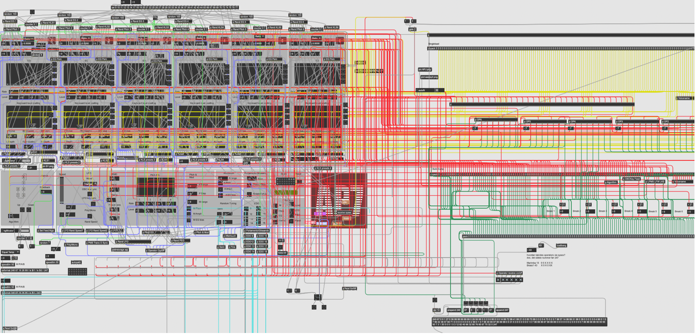 As mentioned earlier, there are quite a few expensive hardware programmers and some software controllers, but for me, it was essential to get to the core of the instrument’s construction and to add new control options that do not exist in other hardware/software versions. The DX-7 was released at the same time as MIDI and celebrates its 41st anniversary this year; therefore, I expected quite a few challenges in terms of control. Quickly, the choice fell on the program Max as the software designer, and control had to take place via MIDI.