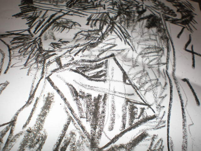 Deciding which images to incorporate into this exposition has been very difficult. I initially intended to include the work of artists who I have exhibited with in juryless exhibitions. However, this has been rejected as I deem it deeply problematic to incorporate their work into my theorising. It does them and their work a disservice to be but an abstract example of juryless art. Considering this, I have included just one image of work by others – it is by an unknown maker and consists of a stick figure on the wall of an abandoned fortress near the border in Ireland. This work does not enact the research but illuminates my ongoing thinking on sublating authorship. I have also included a photograph of the volunteers at London Street Gallery with our No Jury No Prize banner. The other two images (which depict a forest and a woman) derive from work that I have produced over the course of the research. Suitably ambiguous, they evoke the tentative steps the research conclusions took to emerge.