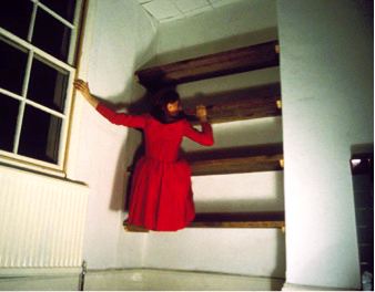 Brown’s equipment piece Man Walking Down the Side of a Building takes a different approach to pairing by reaching (nearly all) its audience through the pre-reflective, or phenomenological, experiencing of observing a person walking. The audience includes individuals who attend its performance (two stagings pictured right) and those who view video footage and/or photographs of its many stagings, including of the original performance in 1970. In this work, the performer displays the identifiable aspects of a person walking vertically on a horizontal surface despite being situated in a horizontal position with feet on a vertical surface. The arms swing in opposition to the legs and the body alignment is straight from head to foot, actions not at all natural to descending the side of a building. This careful orchestration of movements that simulate walking allows the viewer to identify, albeit falsely, an action he or she executes regularly. Sheets-Johnstone’s qualitative structures of movement can again be referenced to better understand the experience of pairing. As in Gunning’s work, the performer’s linear movement quality is the most prominent. With a single dramatic line change from horizontal to vertical, Brown transforms a quotidian activity into an extra-ordinary spectacle, as height and gravity exponentially increase the degree of risk and danger of a two-minute walk. A similar simplicity is found in the present author's video Bevin Court and the Sivill House (see ‘Artworks’). Here too a variable that alters the performer’s movement quality is introduced to an everyday activity, in this instance ascending and descending a stair. The angle of the body is not the variable, rather the variable is a second performer’s engagement with the primary performer, which shifts the amplitudinal quality of her movement. The notable increase in effort behind her movement and greater requisite of balance and strength alters and intensifies their temporal quality. Bevin Court and the Sivill House and Man Walking Down the Side of a Building both employ a distinct shift in movement quality to intervene in an architectural scenario.