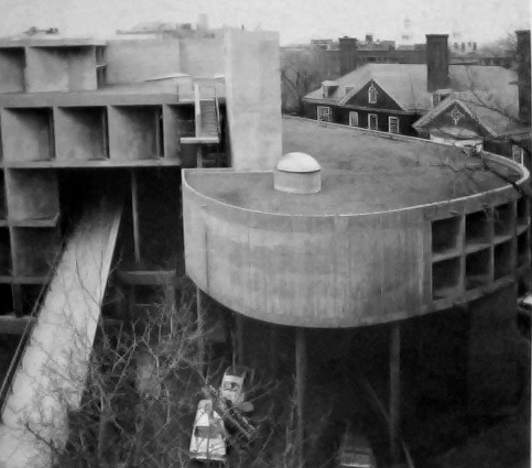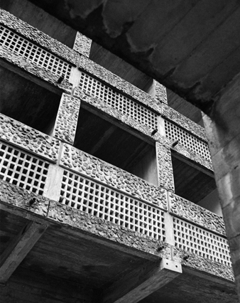 As young architects, Andy MacMillan and Isi Metzstein of the firm Gillespie, Kidd and Coia worked with the Catholic Church of Scotland on an unprecedented number of projects during the post-war building boom. With its innovative design and significant scale, St Peter’s College was regarded as the apex of this collaboration. The young architects showed little restraint in borrowing contemporary architectural language from the International or modernist style acquired during their education at the Glasgow School of Art. Their referencing of Le Corbusier is so assertive that it is possible to read St Peter’s Seminary as a condensed composite of Corbusian quotations. Specific references such as the signature ceiling and irregularly proportioned windows at Ronchamp (1954) or the rock texture of the exterior walkway at the Dominican Order priory of La Tourette (1960) sit alongside more pervasive features of Corbusier’s practice, such as roughly textured concrete and pilotis to lift a building off the ground, vaulted ceilings, pools at the foot of a building, and angled ramps to accommodate level changes. Other specific parallels include the organic curve of the concrete wall of the Carpenter Center for the Visual Arts at Harvard University (1963) and the open interior staircases and glassing-in of the main communal spaces at La Tourette. Stanislaus von Moos observed that Le Corbusier 'was never particularly worried by the distressing spectacle of the rapid deterioration of most of his buildings as long as one thing remained intact: the idea, the pure form, as it is preserved forever in the seven volumes of his Oeuvre complète'.[2] It is arguable that this lack of concern regarding deterioration could have been inherited from Le Corbusier through such a thorough appropriation of his vocabulary.