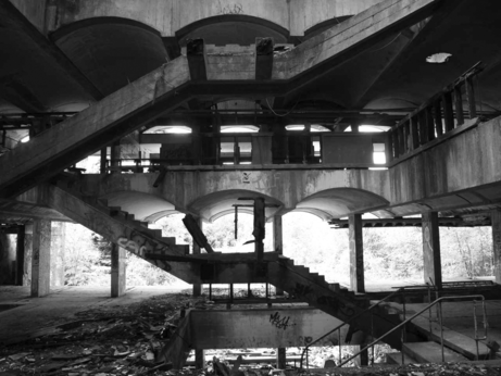 In the photograph St Peter’s Seminary (on the Artworks page), a figure squats low to the ground with another figure draped over her. Together they form a larger mass perched on slender anatomical supports similar to the way that the bulk of the main building was built atop stilts. They are located in the former refectory in the gap that existed between the seating area and a wall of windows. The air temperature in this formerly enclosed area would have been low due to its proximity to such large north-facing windows. The woman in the fore gazes out from what was an underdetermined space of the building. She would likely have been faced with her reflection if the glass were still in place, ensuring her knowledge of the second figure behind her. However, the glass is long gone and her reflection now appears in the rainwater-filled pool between herself and the viewer. Does she look in the direction of the former window in search of the displaced reflection, without an understanding of the building’s current state? Or might the reverse be true: does she turn away from the mirroring surface of the water? Is the second figure a burden being denied, or might the figure in the fore admire this configuration if she were able to locate her reflection?
