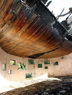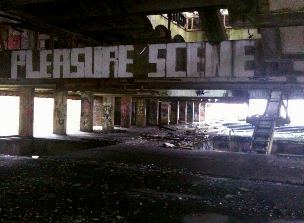 Evidence of a human congregation of squatters and ravers is also apparent. Sleeping bags, mattresses, clothing, food packaging, and general detritus abound. The seminary’s use as a drug rehabilitation facility in the early 1980s may have alerted a related demographic to its otherwise obscure location. During a visit in late 2012, ‘PLEASURE SCENE’ was spelled out in white letters nearly a metre high across a concrete beam above what was the main floor of the large building (pictured right). Remnant paint still swirling out from a bucket in the photographed pool indicated that said pleasure was had fairly recently.