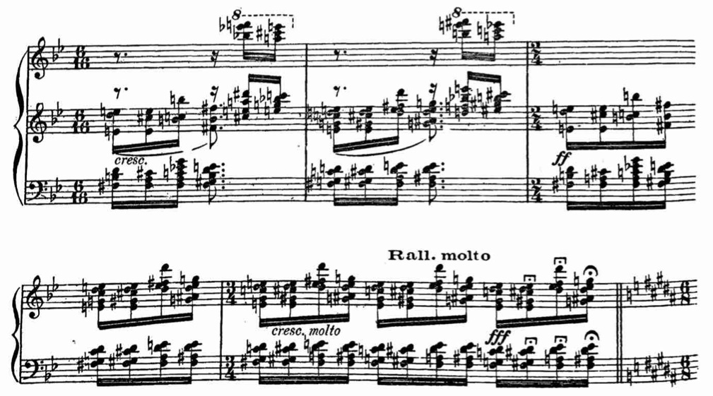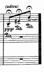 Når stykket no brått snur, med ei melodifrase som badar i brotne harmoniar (sjå noteeksempel 2), er det naturleg at Loriod fortsatt held eit til dels flytande tempo. Ho har ei ro over heile uttrykket, formar frasene og tek litt ekstra tid ved spesielle akkordar, slik at vi kjenner at vi er over i den delen som kan assosierast med ”tårer av farvel”. Eg opplever noko trist og meditativt med denne musikken – eit farvel og eit tomrom – men fordi Loriod lar harmoniane gli av garde er det som at ein òg er forsona med at ”slik vart det”.