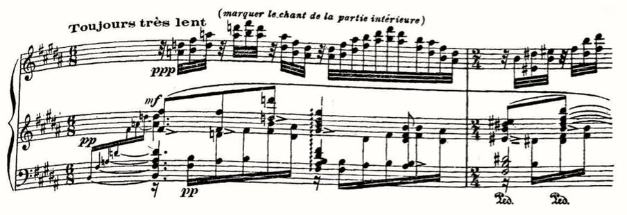 I den andre delen er det ganske opplagt kva tonar og fraser som skal fram på grunn av dynamikk og anna notasjon, som til dømes marcato-teikn. Melodien, som ligg mellom dei svake brotne harmoniane, er i begynnelsen notert med styrkegrad mf og har marcato på den nederste tonen i oktaven. (sjå noteeksempel 2) Då er det naturleg å ikkje spele oktaven like sterk, men å gi litt ekstra på den nedre delen av melodien. Slik er Messiaen svært tydeleg gjennom heile sluttdelen – det er stort sett ingen tvil om kva tonar og melodifraser han ønsker å få fram, og kva som skal ”bade” i ulike lag i bakgrunnen. Men når melodidelen omkransa av brotne harmoniar vert gjenteken, berre med svakare dynamikk, har ikkje Messiaen ført inn noko marcato-teikn for å framheve den eine eller den andre oktavtonen. Her vel eg å gi litt ekstra på dei øverste tonane, fordi eg opplever heile klangbildet som litt mjukare når det spenner frå p til pppp.