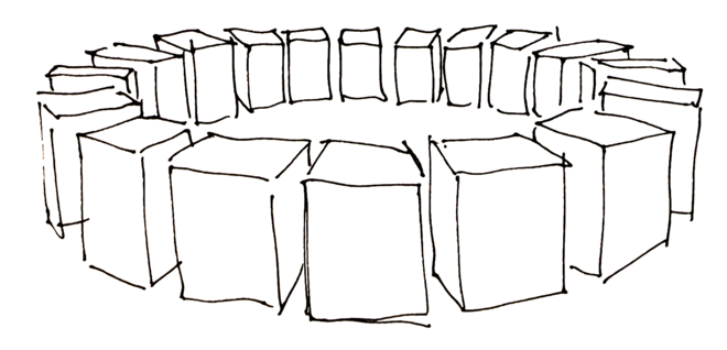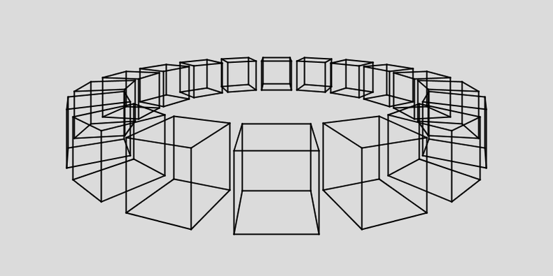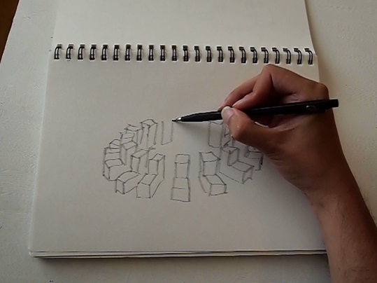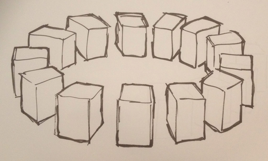 Rapidly draw a circle of boxes in free-hand. Instead of drawing a single box, a circle ensures that a number of angles are exercised. Also, in contrast to just drawing separate drawings of cubes, the circle helps in assessing how well the exercise has succeeded. Any underdrawing should be avoided.