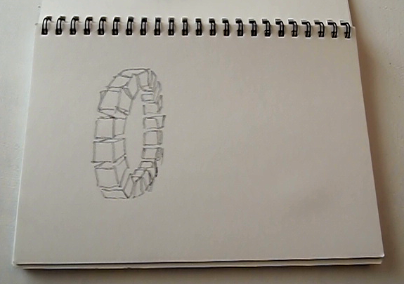I have long worked with the exercise without checking how the shape would look in an unified perspective with the shapes receding into depth. The computer animation at the top of the page demonstrates such a result. If the exercise is developed in this direction, it can be noted that compared to the computer image the hand drawn wheels are bulbous from the back "corners".