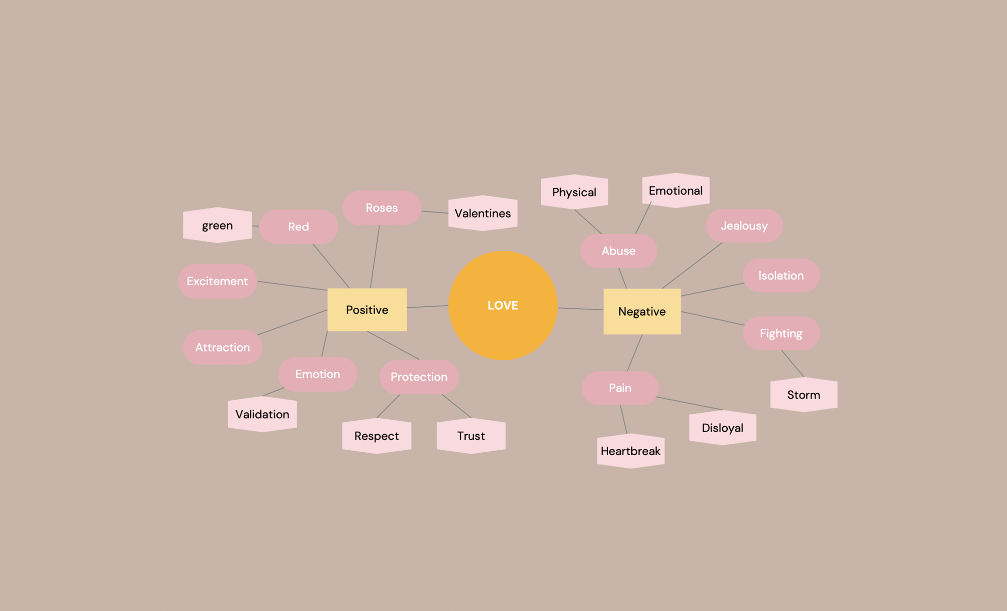 To create a semantic network regarding the word “love”, I firstly separated it between positive and negative love, and then question how I view, experience or observe positive and negative love. This semantic network is however a simplified version, as for each word that was added, new ideas came to mind. Kaufmann (2015, p.42) explains this such as: