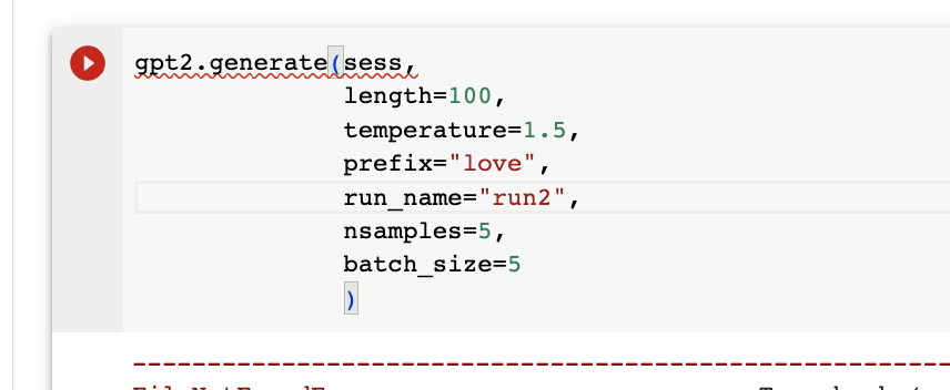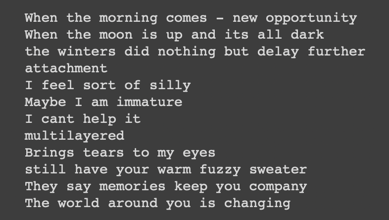 As the CLG is based on my back catalog, I will recognize if direct copies of my songs occur. This is the privilege of using this AI. Using an AI that is fed a large amount of text for a large amount of authors and songwriters, makes it harder to recognize. However, by increasing the temperature of the CLG, the direct copying of text will happen less often. However, by turning the temperature up, the CLG will also be less limited to the reference word. This will have the AI create text more off-topic. By Rachel and I’s experience, the sweet spot for temperature is around 1,7. It stays on the chosen topic but is still mostly producing new lines of text.