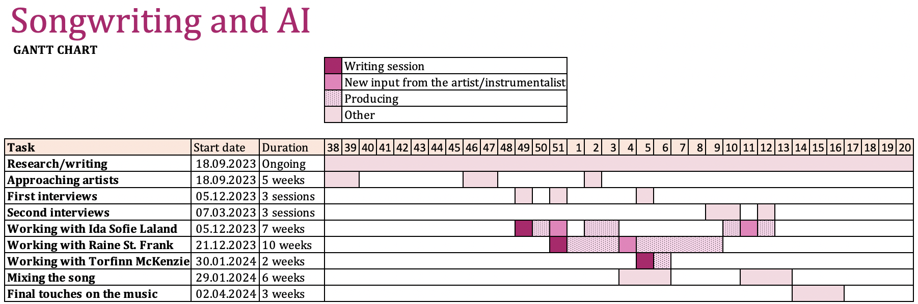 My research question attains the word “their” because we firstly are writing music for their projects. Secondly, it is their experience of using AI that is the main focus of the thesis. The artists participate in one writing session each where they gain the experience of using artificial intelligence concerning lyrics and chord progression. Their expectations and experience will be documented with one interview before and one after the session. They will be asked about their process and how AI did or did not affect the musical process and result. Using AI in their creative process will be new to the participants, but also I will be a new factor. As I am in the session with all three artists, the musical work is considered a collaboration, which will affect the process.